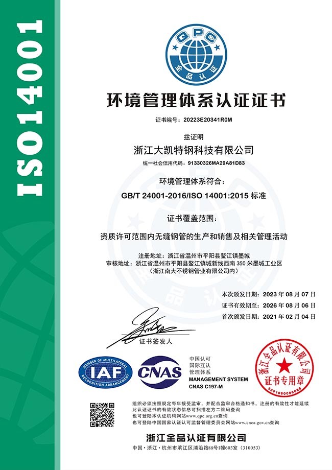 浙江大凱特鋼科技有限公司,原(浙江大凱不銹鋼有限公司)坐落于浙江省溫州市平陽縣鰲江鎮墨城工業區,營銷中心坐落于溫州市龍灣區海濱街道直上路工業園區1號,工廠占地75畝。專業生產不銹鋼,并經營各種材質的圓鋼、無縫管、焊管、緊固件(螺絲)、方管、槽鋼、角鋼、板材、法蘭、彎頭、封頭、閥門、藥機(罐)、塊狀卡壓式水管等業務?,F擁有4臺穿孔機組、16臺冷軋機組、12臺冷拔機組等先進生產設備。